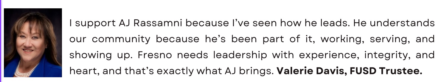 AJ Rassamni is a Fresno resident, entrepreneur, and community leader with more than 40 years of experience. His journey has uniquely prepared him to understand and address the diverse needs of our city.